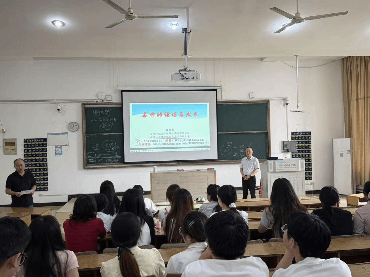 为帮助学生明晰名师成长路径,夯实专业发展基础,9 月 26 日,willhill威廉希尔体育邀请学院优秀校友、正高二级教师、国家“万人计划”教学名师、安徽师范大学附属肥西外国语学校数学老师卫德彬在锦绣校区博约楼 108 教室,举办“名师的锤炼与成长”主题讲座。2025级学科教学(数学)全体学生参与讲座,讲座由willhill威廉希尔体育院长杨刘主持。